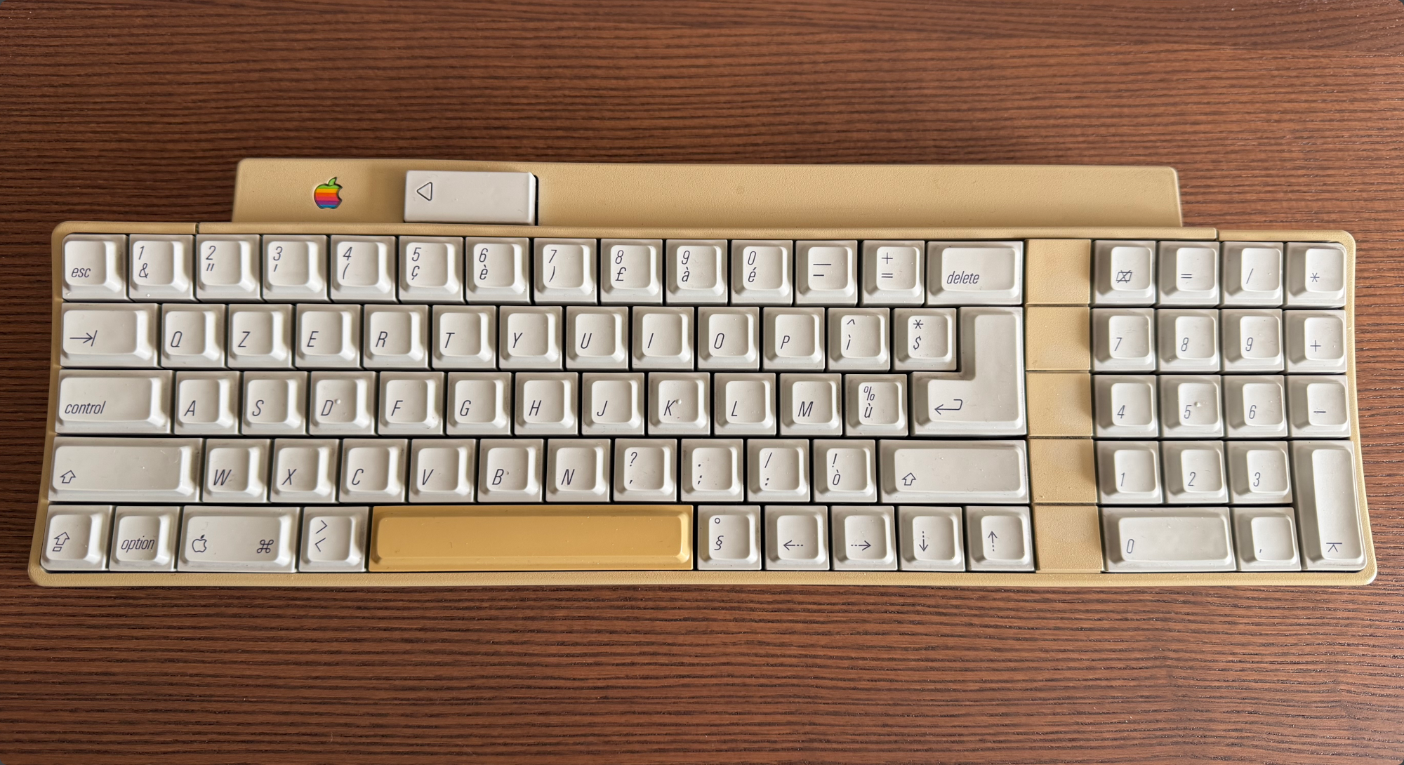 I don't know if you noticed something in the first picture. There is a small rectangular button with a triangle on it, next to the gorgeous rainbow logo. After a bit of research, I discovered it was used to power the computer on and off directly from the keyboard. Apple actually retained this feature to this day in newer models, although the choice of the triangle icon is a bit odd, to be honest. Out of the box, the key does nothing. Steve Chamberlin even wrote on his blog about the difficulty of replicating the same behavior with the converter. So I thought this key could potentially be used as a Fn modifier, allowing me to create all sorts of combinations. Obviously, this could not be achieved with Steve's converter alone and I couldn't just use Karabiner-Elements since it's blocked on my work laptop. So I had to come up with a software solution.