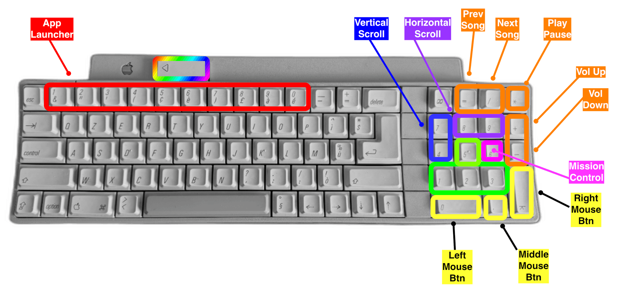 I started by remapping the Power key to F13 via firmware. Then I looked for the best way to write this software that would let me use macOS APIs to execute commands, control media keys, and finally... move my mouse cursor!