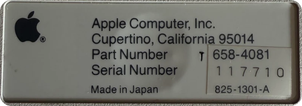 The exact model is the A9M0330 (658-4081), also known simply as the Apple ADB Keyboard. It was built in Japan, probably in 1986, when the IIGS was released. It was the first model to feature the ADB connector, allowing you to daisy-chain other peripherals (like a mouse), which is very neat compared to that weird reversed phone jack on the M0110/A. Another fun fact I read is that the font used on the keycaps is called Univers Light Condensed Oblique, which also appears on my other Powerbook Duo 280c.